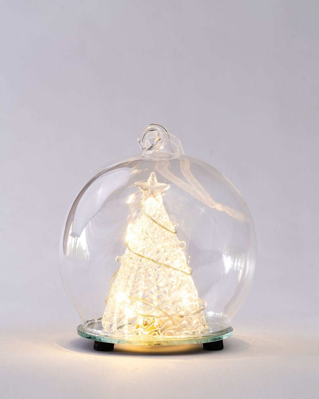 A lovely twinkly glass Christmas Tree featuring a Star on top and sitting within glass globe.
