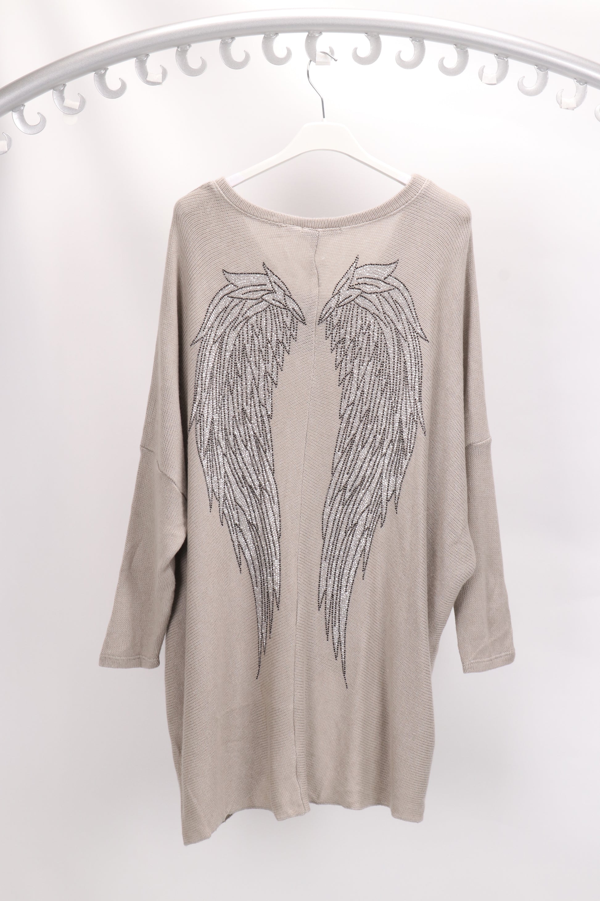 Super soft relaxed knit with raw hem and embellished angel wings on back