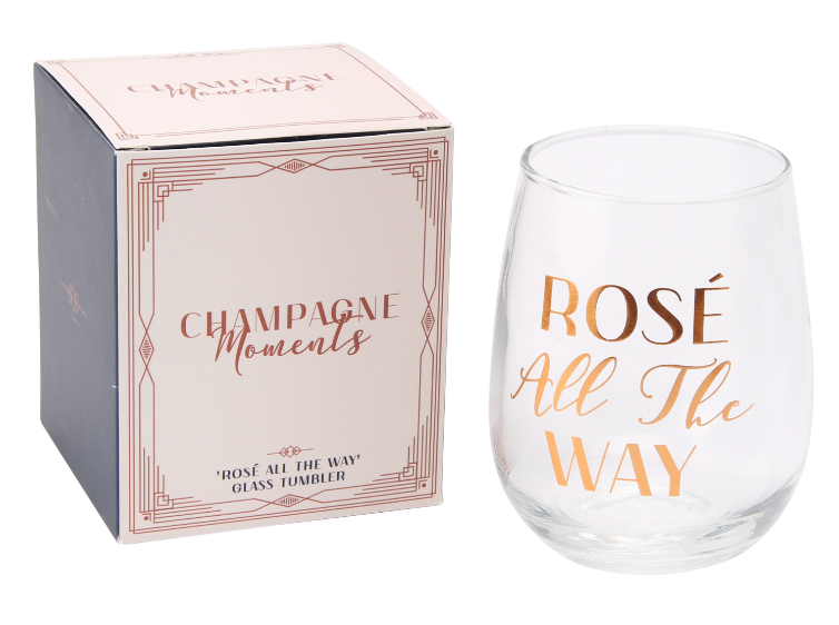 Rose all the way in metallic gold on a stemless wine glass. Comes in branded box packaging.