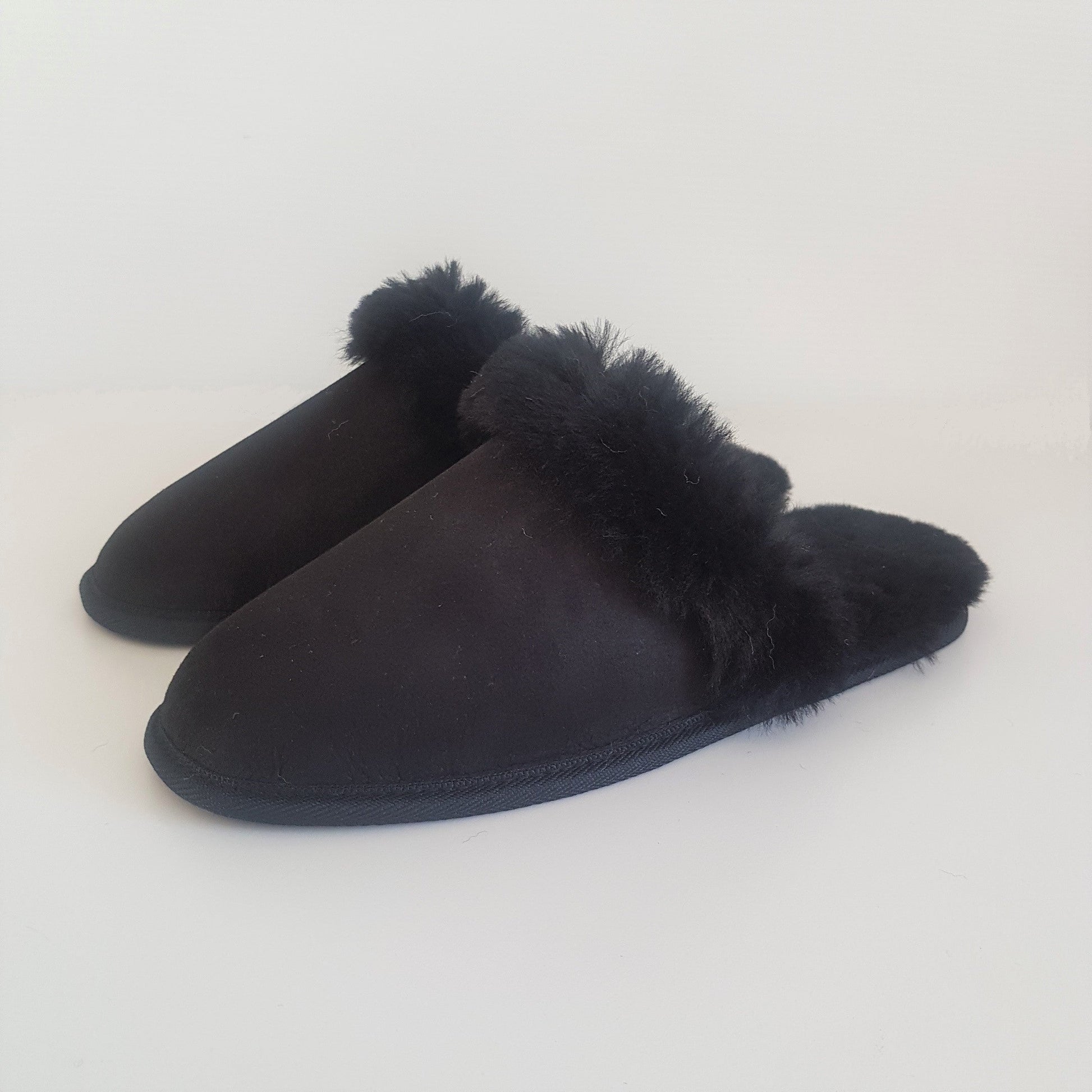 Lightweight sheepskin scuff with rolled cuff and ribbed sole for grip.