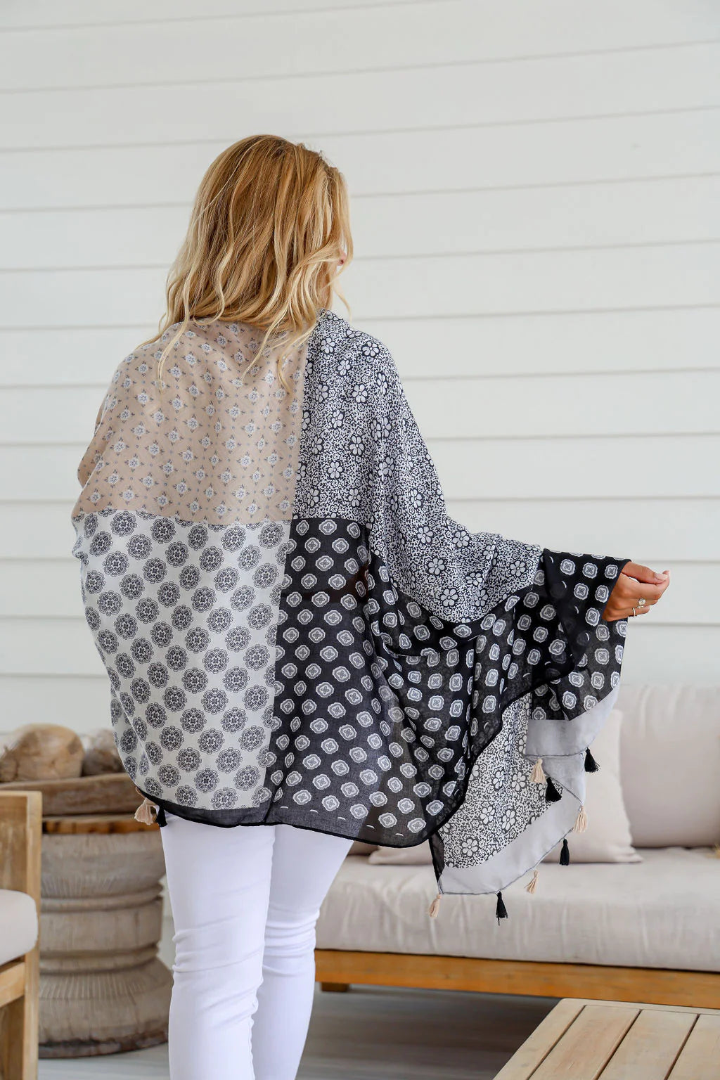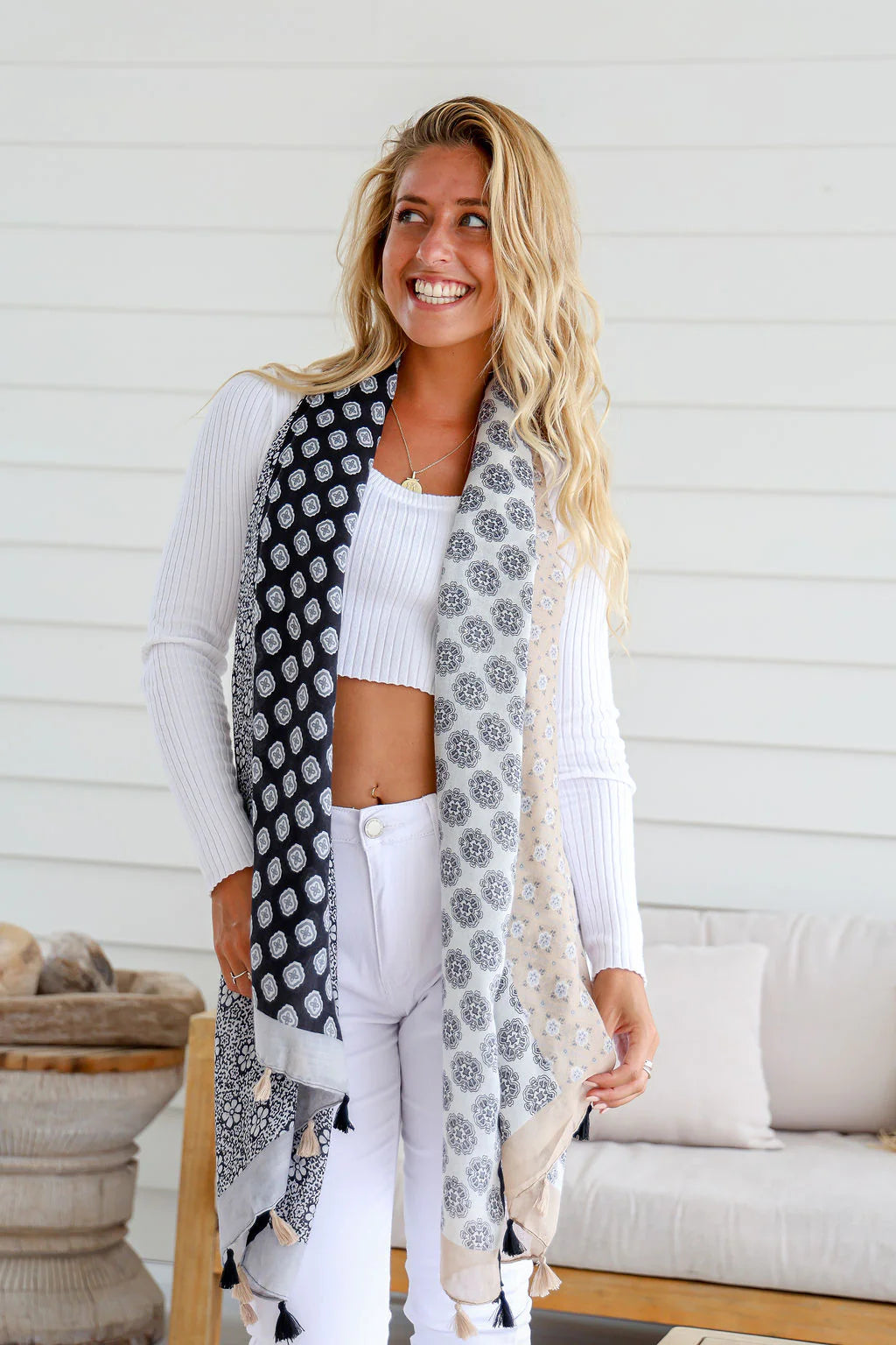 A funky 100% viscose accessory that features a unique black, tan and white Moroccan pattern. Perfect for adding a touch of quirkiness to any outfit.